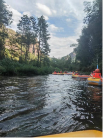 We split into two groups and worked together in groups and came up with team names and slogans. One was called Money More and the other was called Money Less. Some people had water scoops and water guns, during the rafting they would use these as weapons and attack each other. There were a few places where the drop was quite big and it was exciting to float through, it felt like the boat and the people were all in the water. Everyone had a great time.